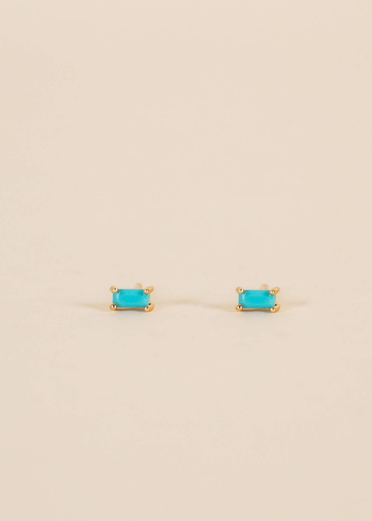 A customer favorite, our turquoise baguette is made for stacking! Featuring a petite polished turquoise stone cut into shape and set in an 18k gold-plated prong earring over sterling silver. Tarnish Free - Long lasting protective coating safeguarding your jewelry from sweat, water, and more. Sterling Silver Posts – 18K gold plating over brass Hypoallergenic – Lead Free Turquoise Stone Approx. height 5mm
