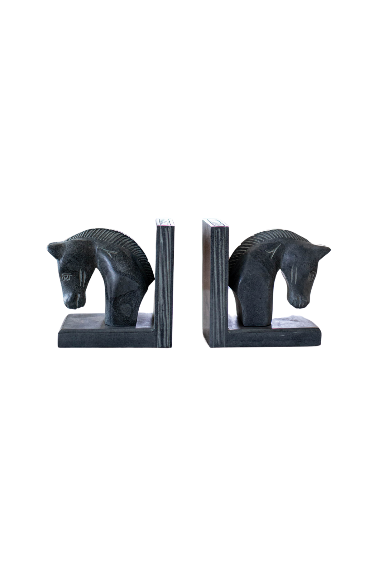 Dimensions 5" Height x 5.5" Width Crafted from natural stone, these bookends feature carved horse designs that add a touch of elegance and sophistication to any bookshelf. Made with expert craftsmanship and a keen eye for detail. Set of 2 This pair of bookends has been crafted from natural stone, some slight variations may occur. Made In India