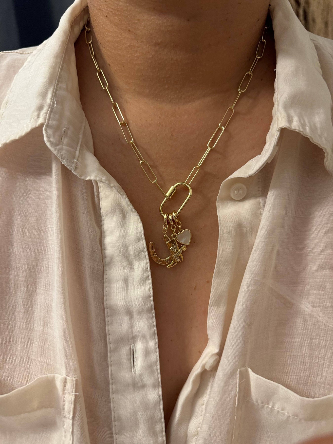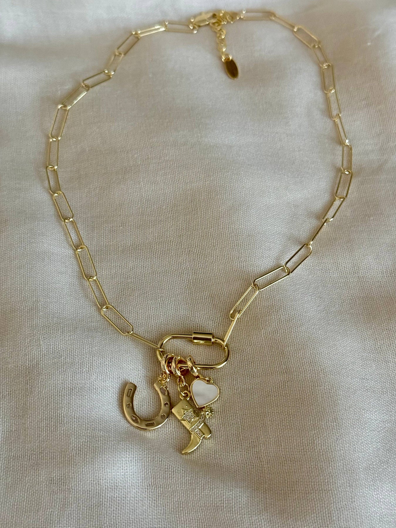 This necklace features a delicate link chain adorned with 3 charms including a horseshoe charm, a symbol of good luck. With its playful charms, this necklace is the perfect accessory for adding a fun touch to any outfit. The Lucky necklace is a must-have for those who don't take themselves too seriously. - 18kt gold plated over sterling silver and brass - 16” necklace with a 2” extender - nickel free