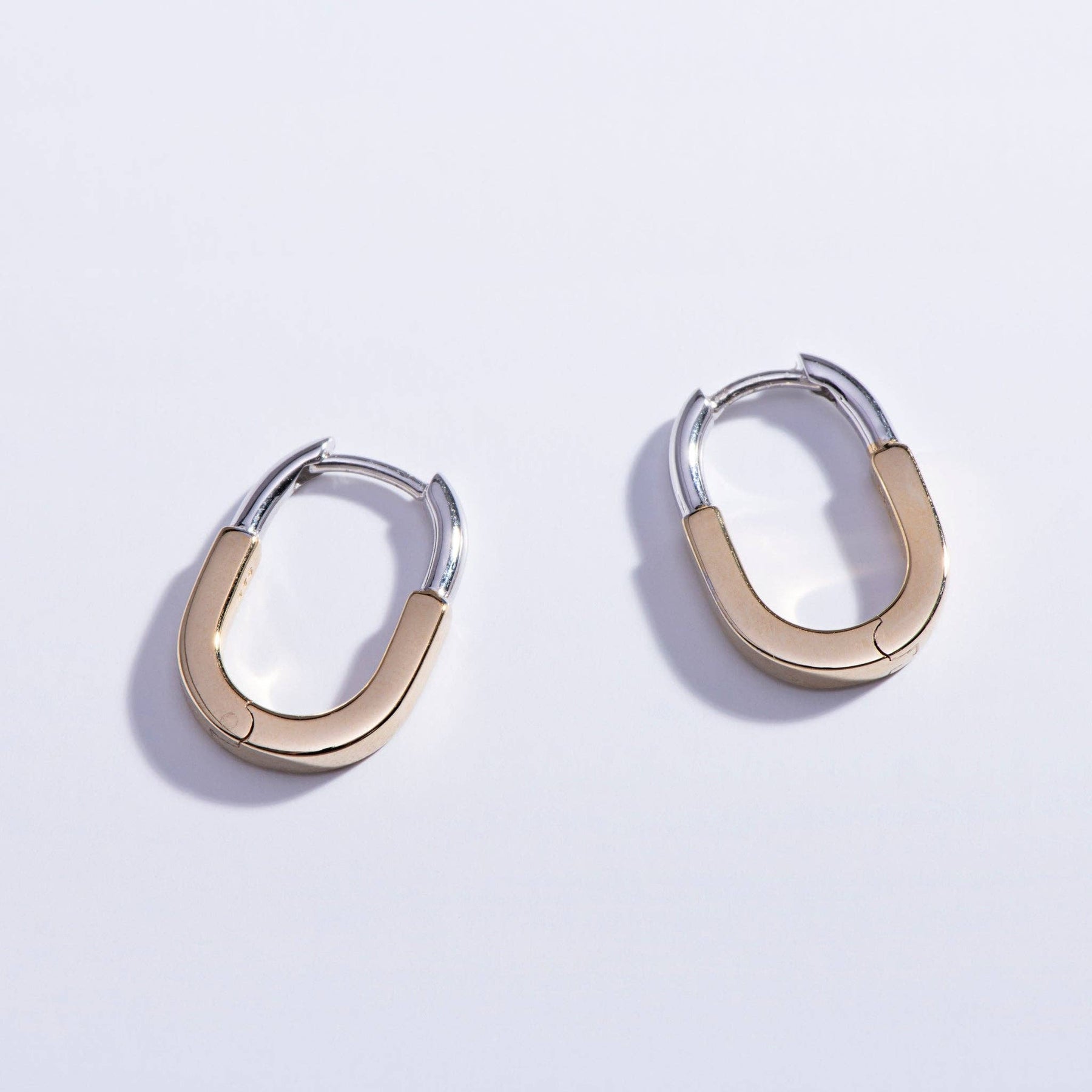 Minimalist mixed metal hoops to go with every look. DETAILS - 14k gold-plated sterling silver - Hinge clasp closure - Includes e-coat: scratch, tarnish, and water-resistant πŸ’¦ Nickel-free and naturally hypoallergenic - Measures 1.4 cm x 2 cm