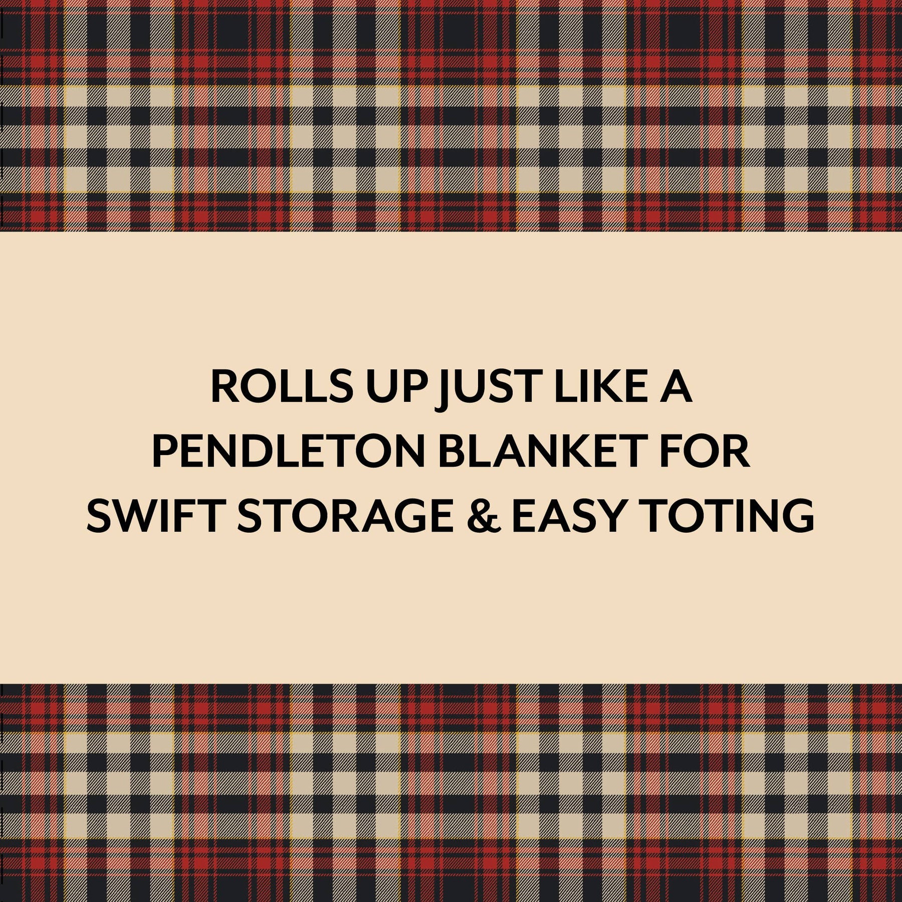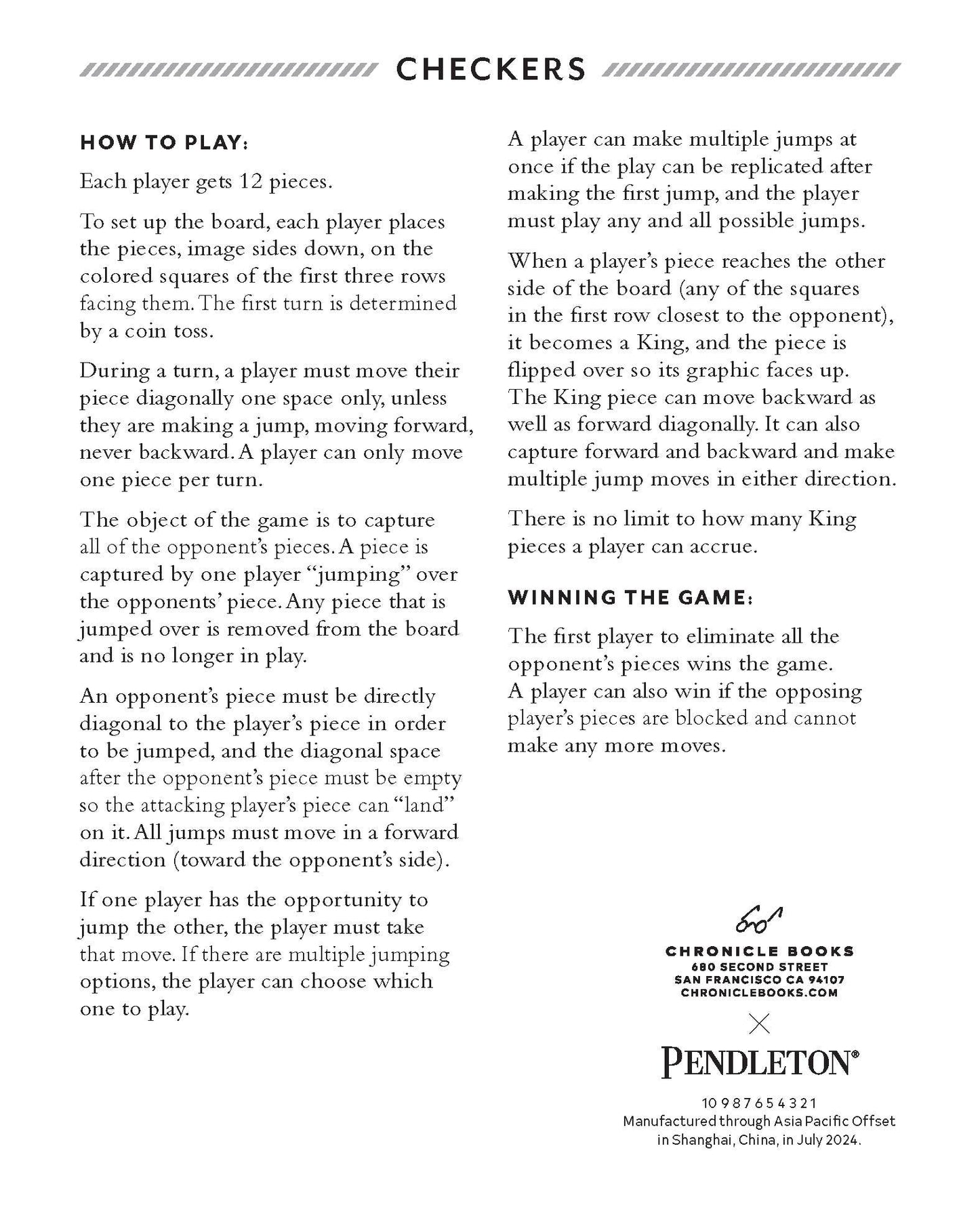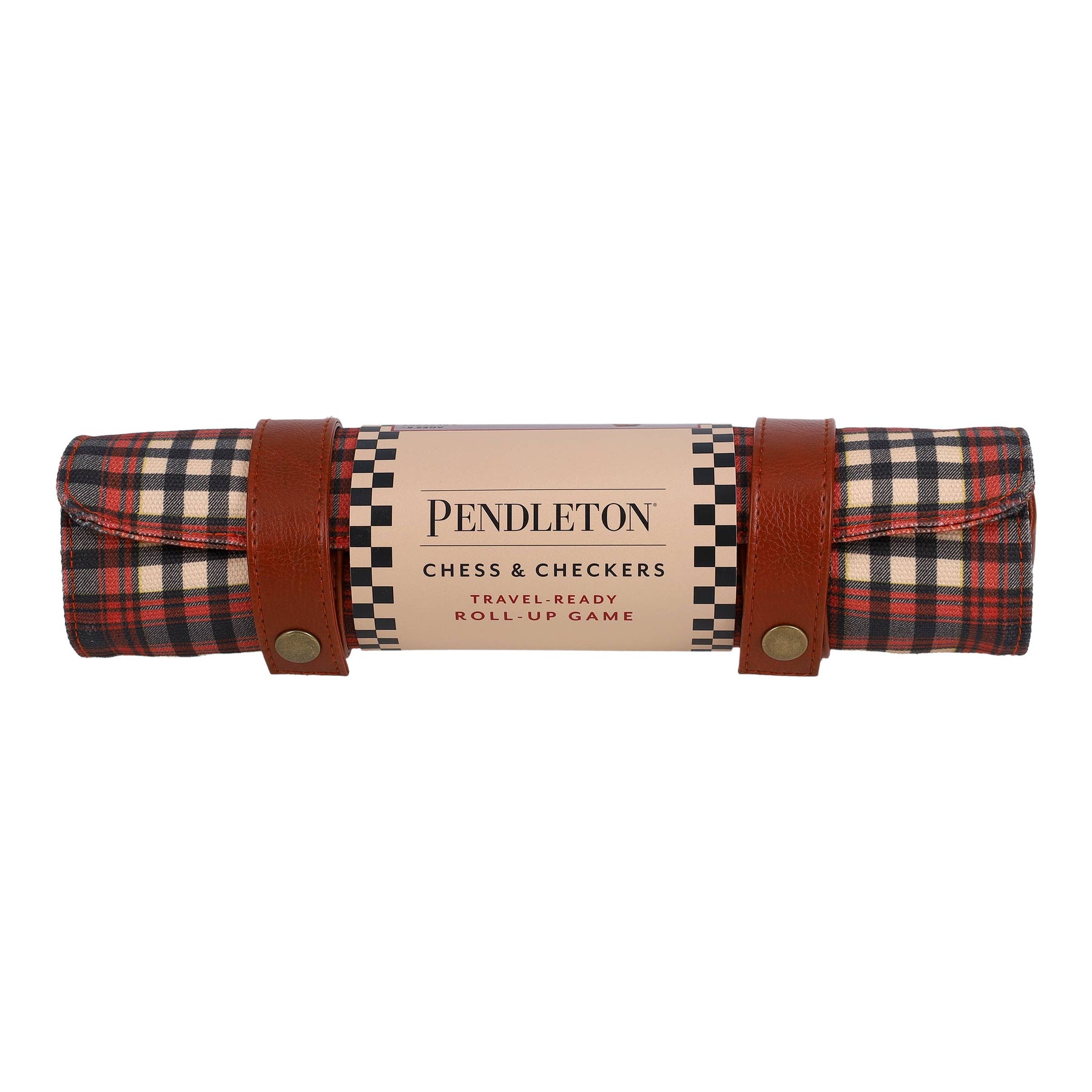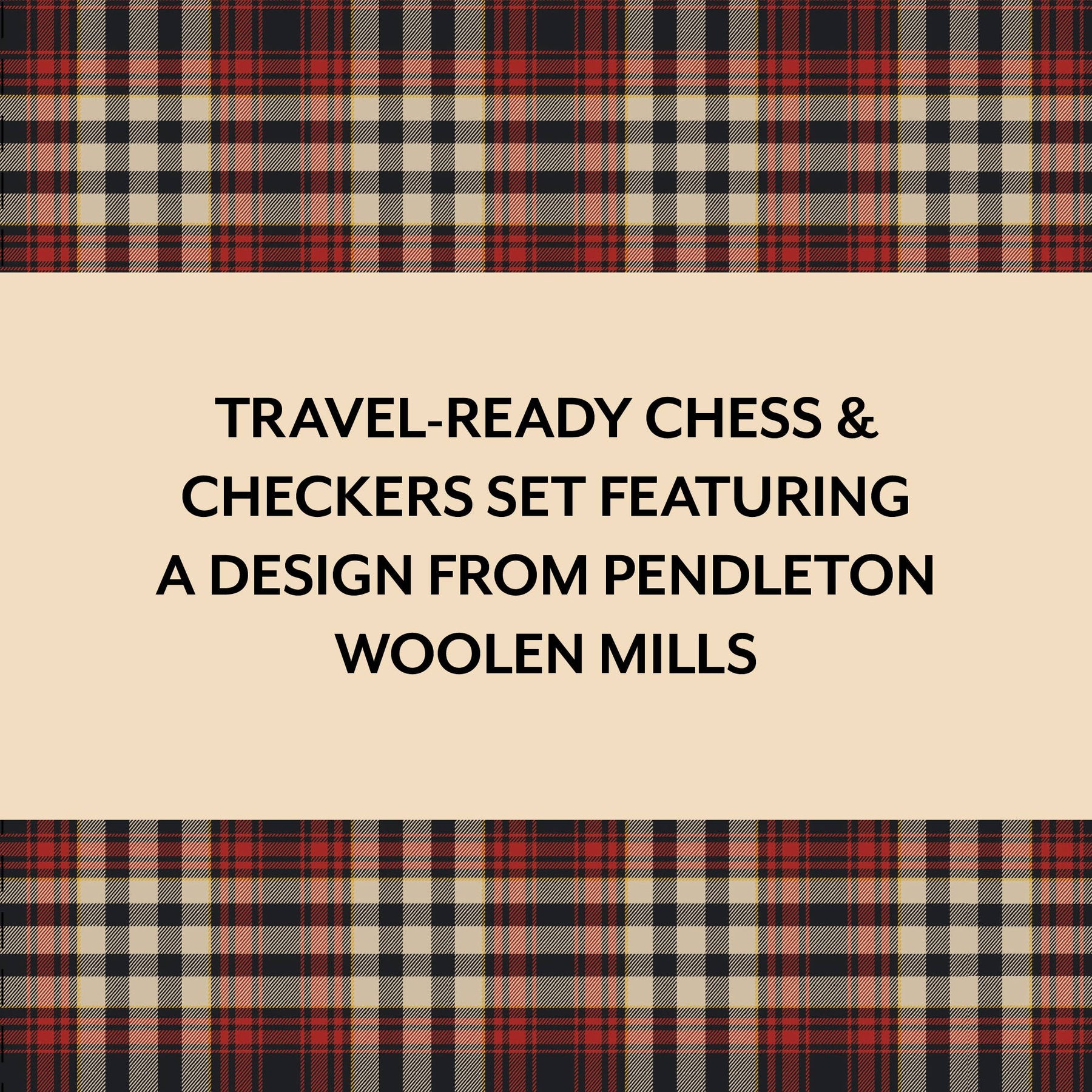 An exciting addition to the popular Pendleton game line: a Chess & Checkers set in the cozy and classic Red Black Check pattern. Roll out the fun at home, camp, or on the road with this travel-friendly game set. Canvas playing board features a colorful Pendleton pattern and rolls up for easy toting. The set includes 32 silkscreened wooden game pieces that reverse for play as chess or checkers, plus a vegan leather storage bag. Instructions included. CLASSIC PENDLETON PATTERN GAME: This travel-ready chess and checkers set from the iconic Pendleton brand features a canvas board and snap-on vegan leather pouch for storing pieces. TRAVEL CHESS & CHECKERS: Checkers and chess are classic board games enjoyed by all ages.